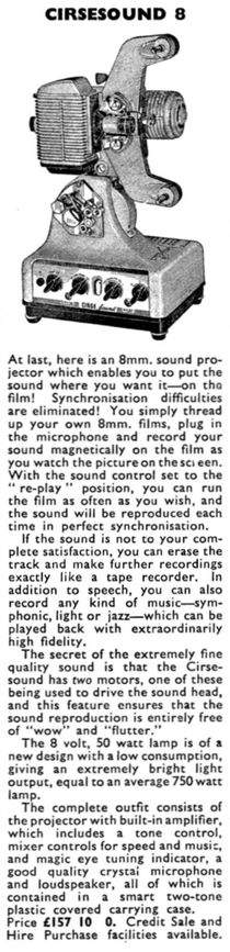 The CirseSound was the first Cirse projector with an integrated amplifier. It was the successor of the Cometson. It shared many aspects, such as the film transportation mechanism with the silent Missouri. It was widely admired and built a strong reputation, quite remarkable for a projector that was only produced for four years. Its production was discontinued by the end of 1962. Its successor, the Silma Sonik 8 had been delayed by strikes in Italy and did not appear until 1963.